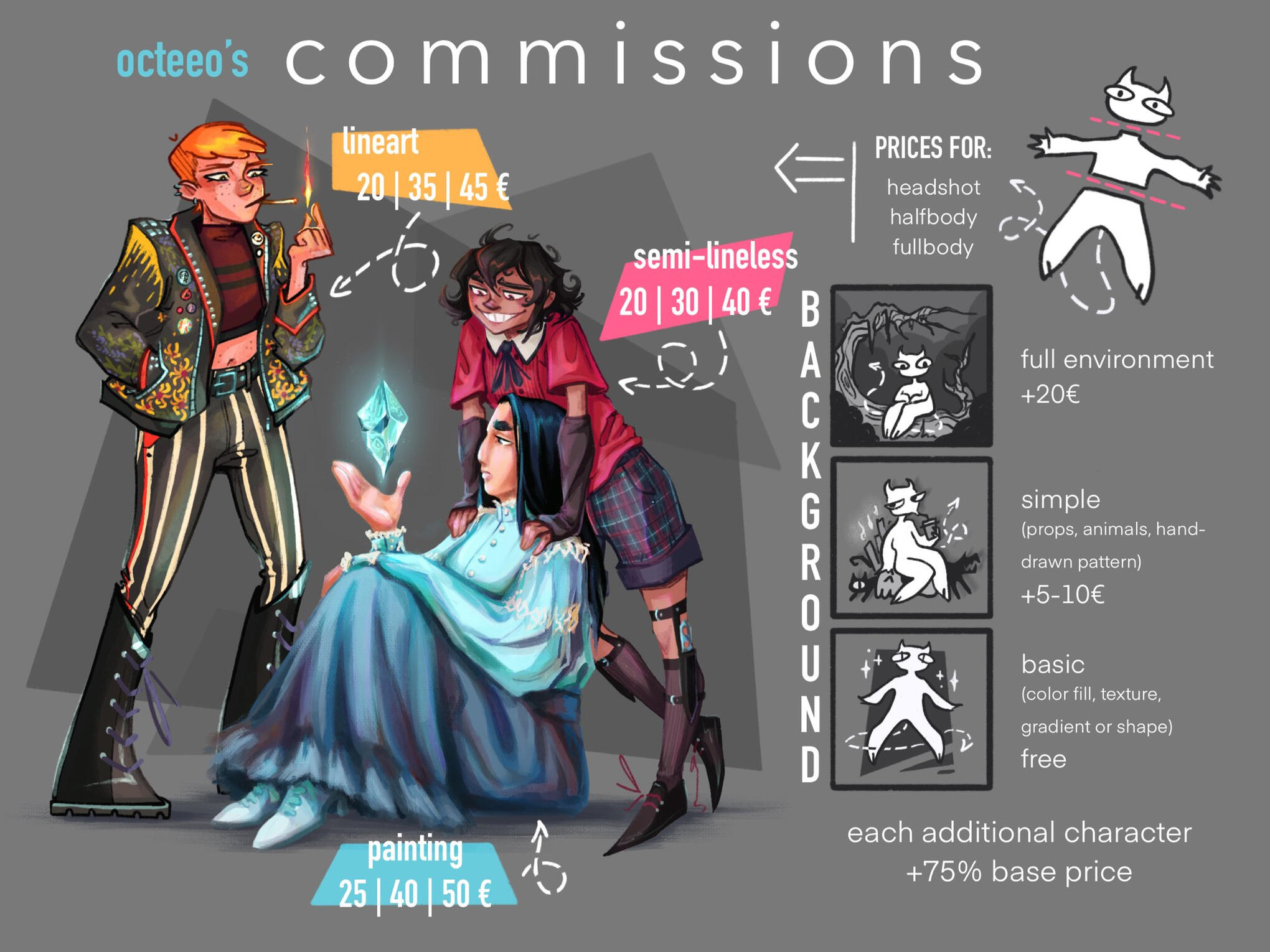 these prices are for personal, non-commercial commissions only. commercial prices will be higher and can be discussed with me directly